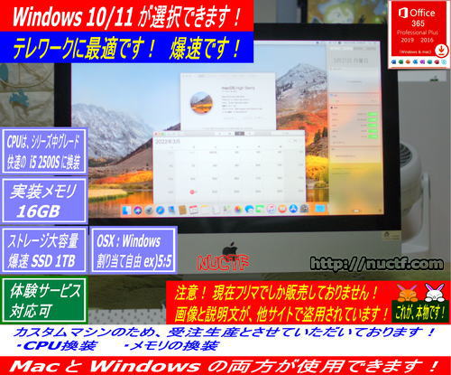 iMac2011 mid の 出品です! 久しぶりに・・ iMac2011 mid の出品です! グラフィックカードが・・ Metal 非対応のため、 OSX が・・ High Sierra までしか対応していませんので・・ Mac OS を使用される方にとっては・・ 現状では・・ もはや・・ 限界って感じですが・・ 反面・・ Windows につきましては・・ Windows 10 / 11 がインストール可能ですので・・ まだまだ・・ 現役・・ バリバリです!! 私も・・ サブ機として・・ 使用しており・・ 大変重宝しています。 本機が・・ OSX Catalina で、足切りを余儀なくされた理由は・・ CPUの性能ではなく・・ グラフィックカードが・・ Metal 非対応が原因なのです。 されに言えば・・ グラフィックカードを GeForce 等の Metal 対応に交換して・・ iMac2011用のRom データに書き換えれば・・ OSX Catalina のみならず・・ 最新のOSも動作が可能なのです。 これは・・ そんなに難しいことではなく、実施されている方もおられます。 ただ・・ 27inch のグラフィックカードは・・ 比較的リーズナブルなのですが・・ 21.5inch につきましては・・ かなり高価なため・・ 実用的ではなく・・ iMac2012Late を購入した方が得策なのが現状です。 だた・・ 言えることは・・ Mac信者に不可能は無いということかなぁ・・(^○^) アハハ ・まだまだ現役です・・ 壊れそうに無いからねぇ・・(^○^) アハハ ・Mac OS は・・ High Sierra で、打ち止めだけど・・ ・液晶画面 + 保護ガラスの構成が・・ 最高です。 汚れたら・・ 保護ガラスを洗えば・・ いつも・・ ピカピカです・・ また・・ DVD搭載のオールインワンというのも・・ 魅力的ですねぇ・・
