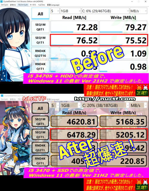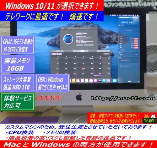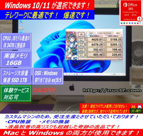 ・約84.6倍です・・ まさに・・ 超爆速です・・ 体験サービスも実施していますので・・ お近くの方は・・ ご遠慮なく・・ お申し出ください。 車で・・ お伺いさせていただきますので・・ コロナ対策も万全です・・ インバーターで、電源を確保して・・ スマホのテザリングで、インターネットをご体験いただけます。 【商品説明】 --------------------------------------------------------------iMac 2012 Late 21.5改 i5 3470【爆速・超美品】 ・画像と説明文が丸ごと、他サイトで盗用されていますので、 ご注意ください。 ・並行処理を多用しないのであれば、爆速・快適です。 つまり、i7 でなくても i5 で十分という方にお勧めです。 ・長く使えるデスクトップマシン(相棒)となること間違いなしです。 ・Mac と Windows の両方が使用可能で、お得感満載です。 ・ディスプレイのマスキングテープは、出荷時には画面を接着しますのでなくなります。 【お願い】 ・ご質問は、実績でご判断くださいますようお願いいたします。 ※特にMac初心者の方は、よく調べてからお願い致します。 ※ご購入の際は、Windows 種別 と SSDの配分をお知らせください。 【特徴】 本iMacは、単なる中古販売ではなく、これから本格的に使っていただきたくチューニングを施したものです。 よって、他より割高になることをご了承ください。 ご理解していただける方のご購入を心よりお待ちしています。 ※性能につきましては、10枚目のデータを比較していただければ一目瞭然です。 ※無期限のアフターサービス付きです(連絡先等を同梱) ※お近くであれば、体験サービスをさせていただきますので、お申し出ください。 【仕様】 CPU: Intel Core i5 3.2GHz(i5 3470)(Turbo Boost使用時最大3.6GHz)4コア4スレッド DSP: 21.5インチ NVIDIA GeForce GT 650M(512MB GDDR5メモリ) MEM: 16GB (8GB×2) SSD: 1TB (SAMSUNG 870QVO) 新品(Mac/Windows 均等割・配分指定可) 【ソフト】 MacOS: Catalina 10.15.7 WinOS: Windows10 / 11 Pro 64bit Ver21H2 MS Office365、Macs Fan Contorol 他 【付属品】 ・本体、電源コード #iMac2012_CPU換装 #爆速iMac #iMac爆速 #爆速Mac製作所 #爆速PC #Windows11_V21H1 #i5_3470-------------------------------------------------------------- 今更ながら・・ 最近・・ ブログも・・ 始めましたので・・ よろしくお願いいたします。 そのうち・・ ネタが尽きれば・・ うさぎ や ネコ が・・ 登場しますので・・(^○^) アハハ